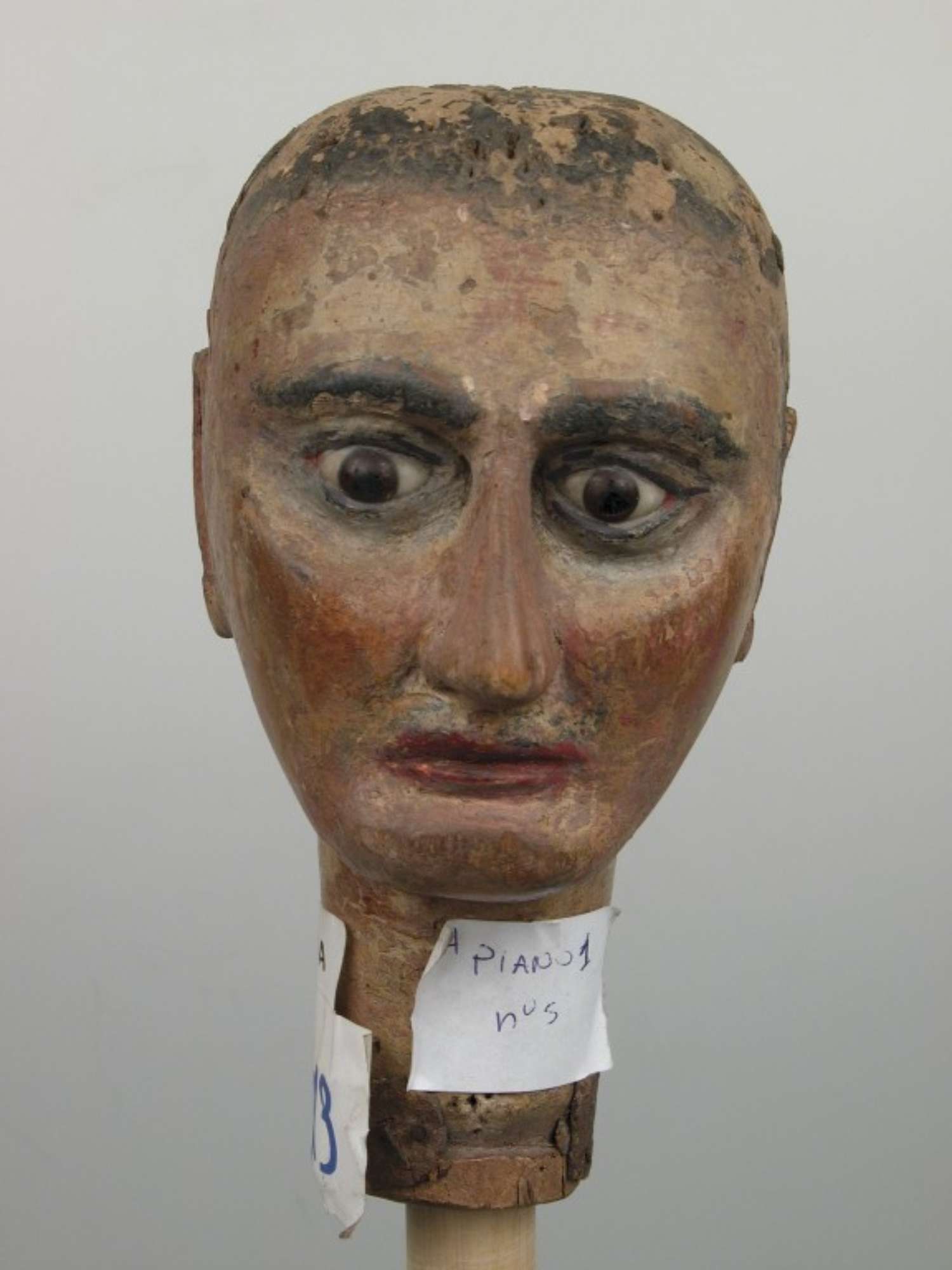La testa di marionetta in esame raffigura un volto maschile con naso aquilino e con gli occhi scuri dipinti.