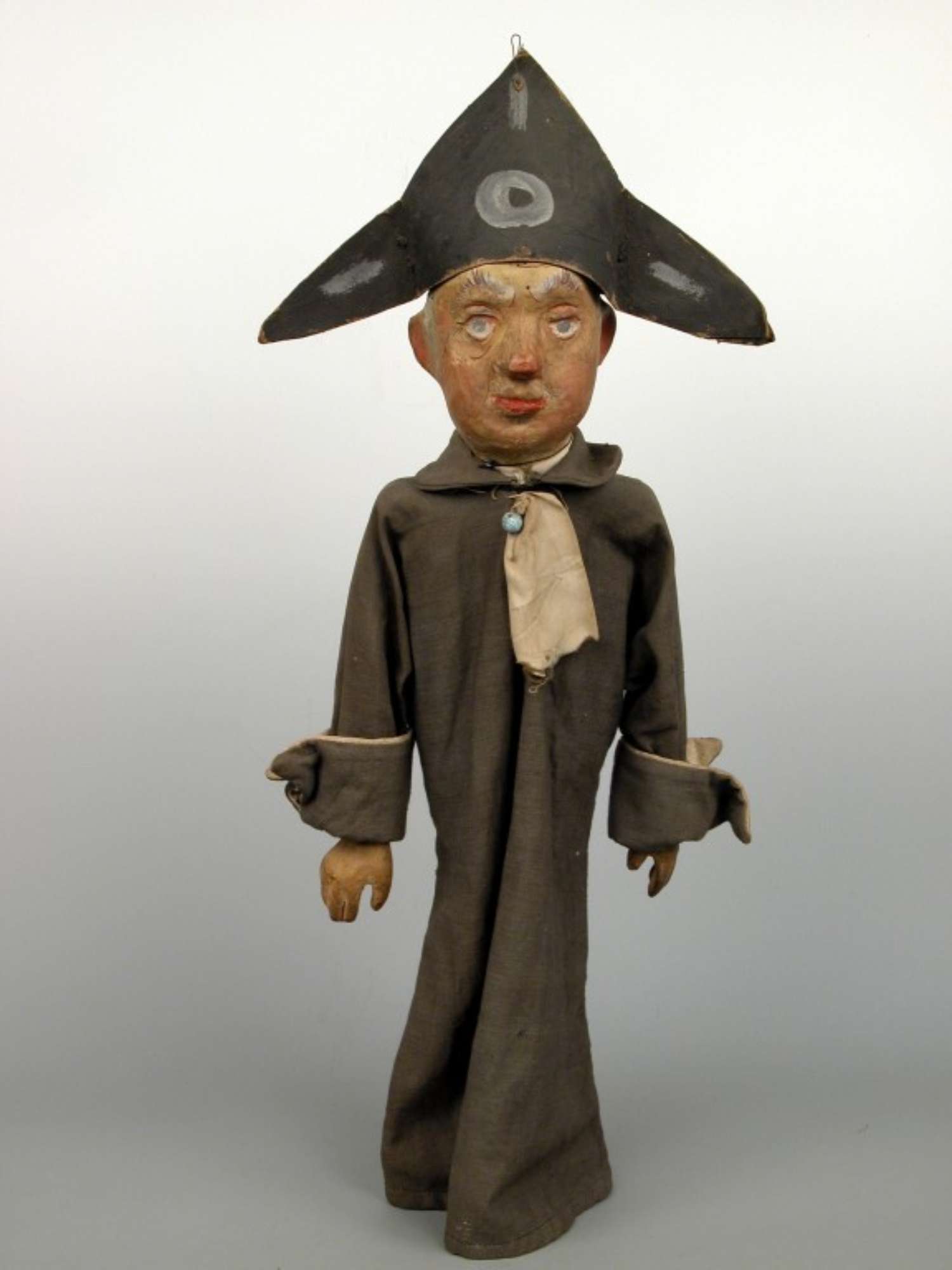 Il fantoccio in esame rappresenta una figura maschile con indosso un vestito grigio, col davantino bianco e cappello in cartone di colore nero.