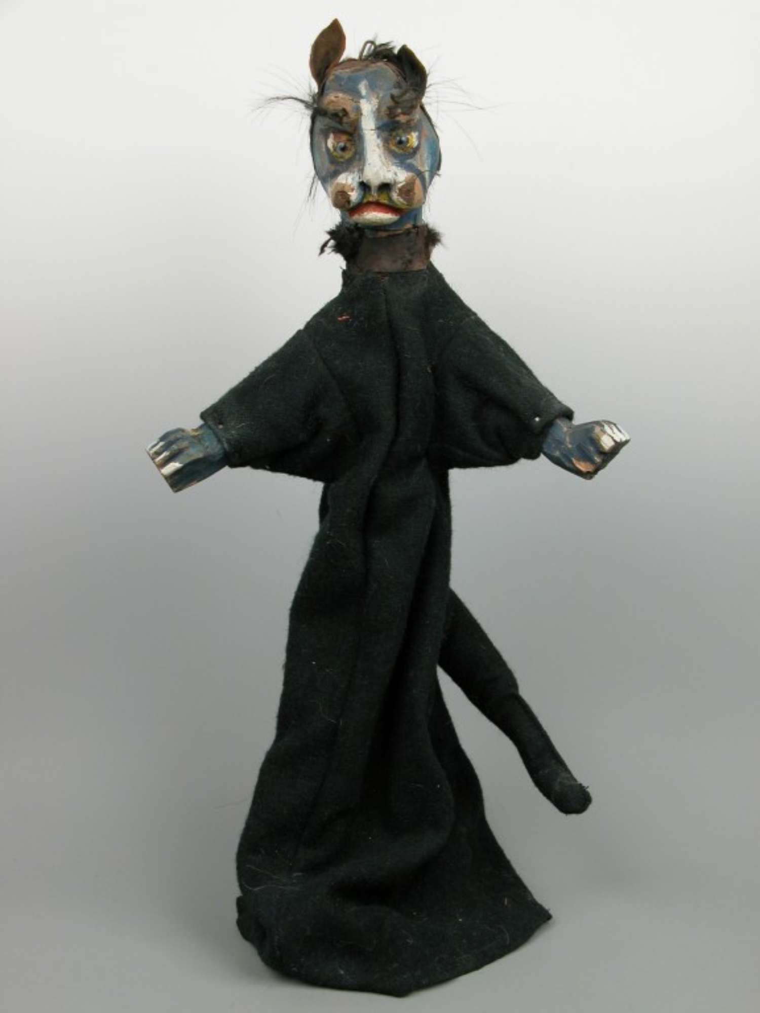 Il burattino in esame raffigura una figura di gatto con volto e zampe anteriori in legno, dipinto di blu; il corpo è coperto da un abito nero in panno con coda.