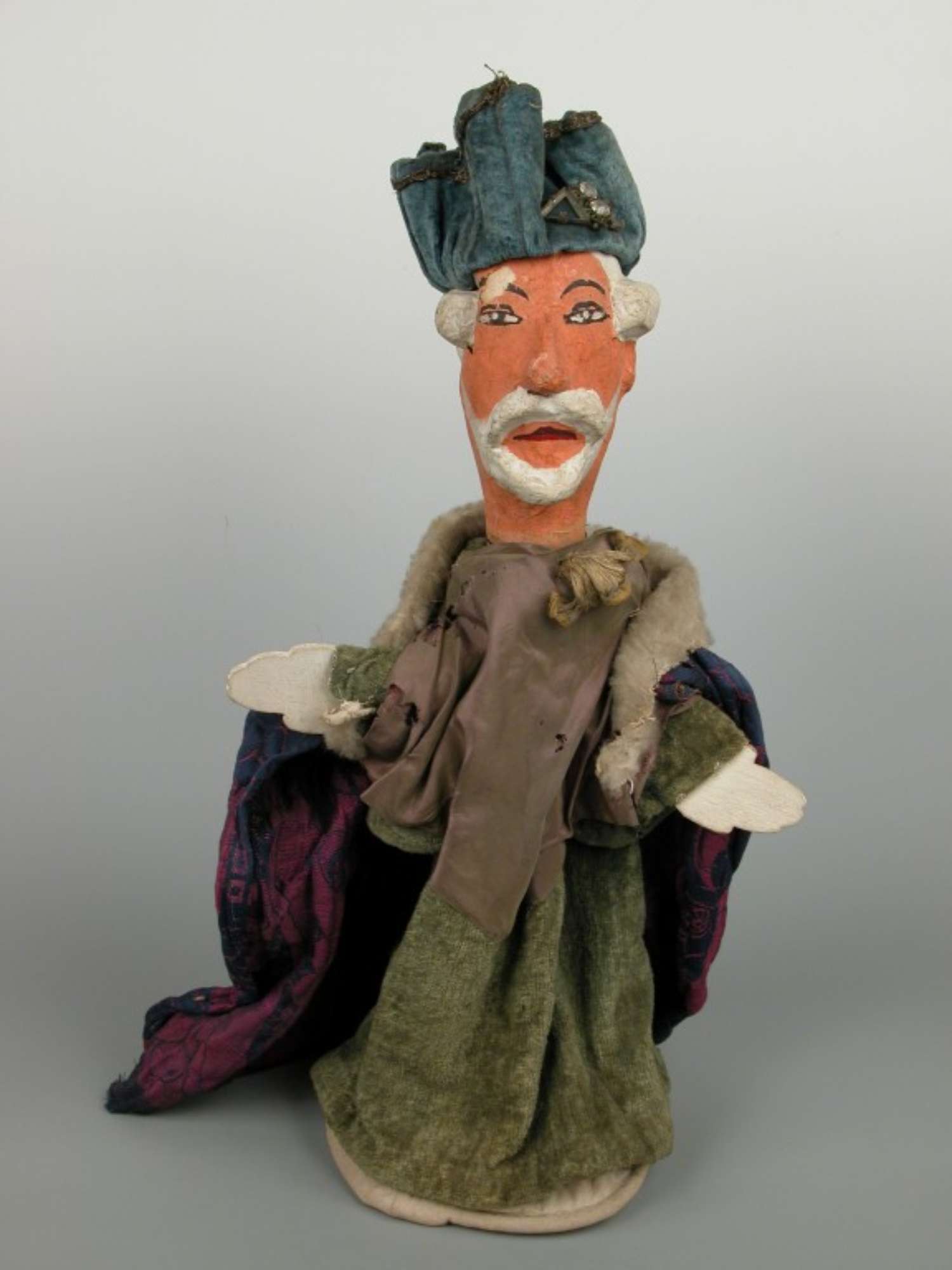 Il burattino in esame rappresenta una figura maschile anziana, con capelli, baffi e barba dipinti; le mani sono in lego e sono di colore bianco. Indossa un abito in velluto verde con davantino in fodera di raso marrone e mantello blu-bordeaux. Sul capo porta un cappellino in velluto color blu petrolio.