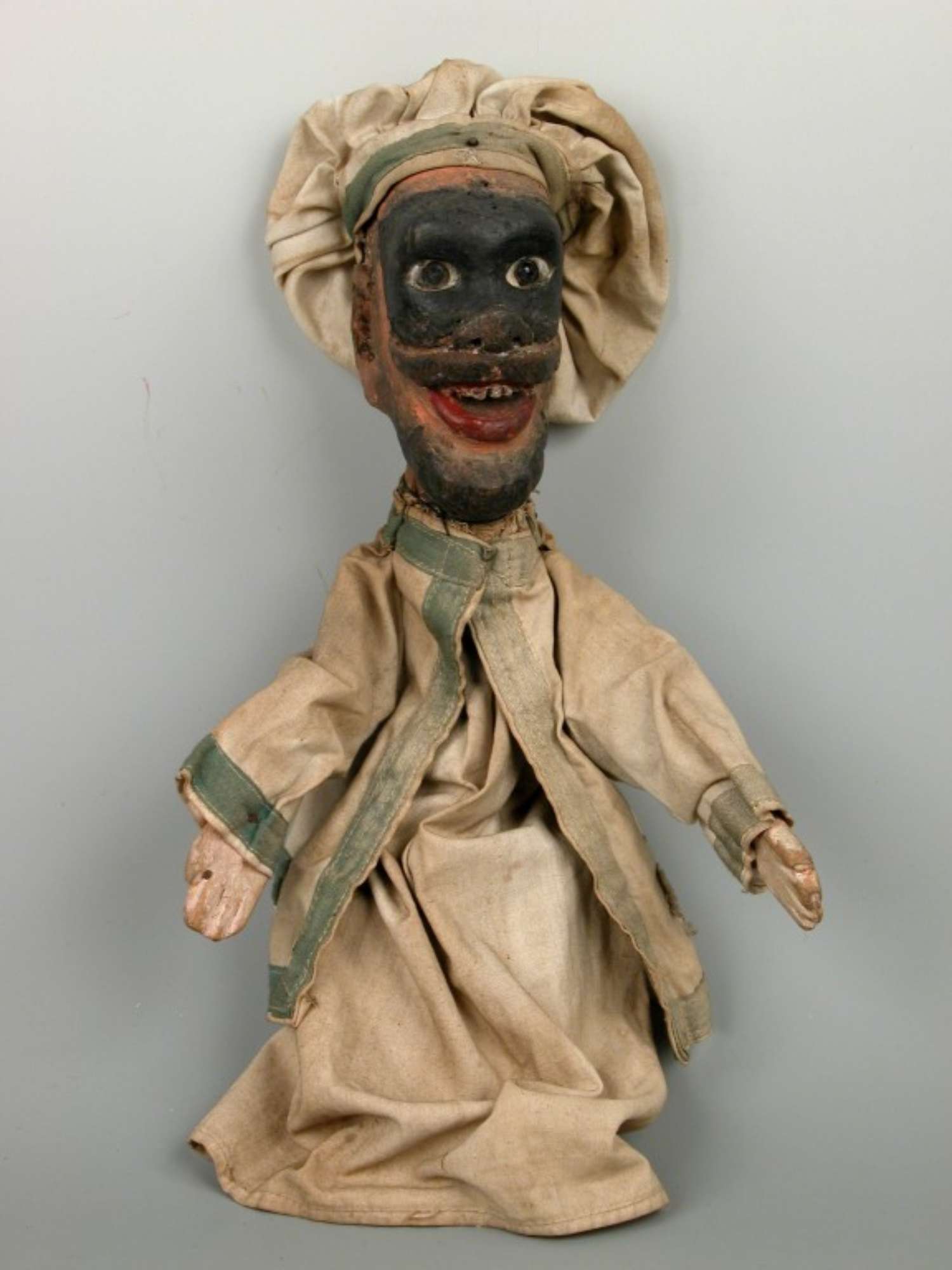 Il burattino in esame raffigura Brighella. Indossa un abito bianco con giacchina col bordo verde, un berretto bianco con una fascia verde e bauta nera.