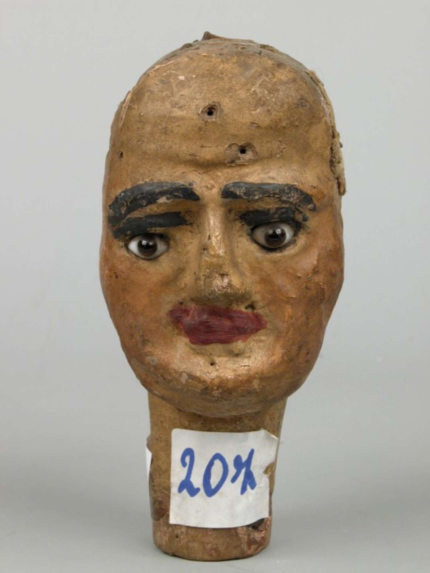 La testa di marionetta in esame raffigura il volto di un giovane uomo dall'espressione triste. Gli occhi in vetro sono neri e fissi.