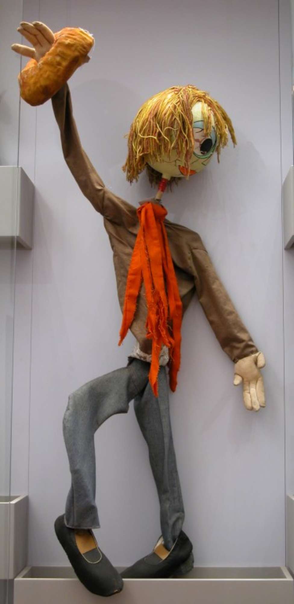 Il fantoccio in esame raffigura una figura maschile dalla testa rotonda, con capelli biondi realizzati in lana. Indossa una camicia marrone, con un foulard al collo color arancio e pantaloni grigi. Tiene il braccio destro alzato e in mano tiene una grande ciambella in gommapiuma.
