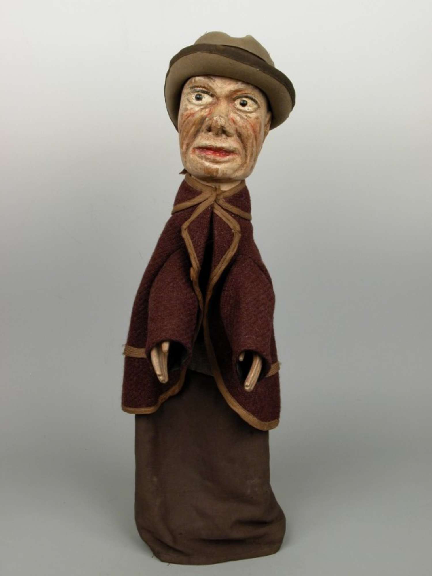 Il burattino in esame rappresenta una figura maschile con occhi neri. Indossa un cappello, tipo borsalino, calato sugli occhi, una giacca bordeaux con profili in marrone, un abito marrone con gilet nocciola e bottoni marroni, e una camicia a righe verdi e bianche.