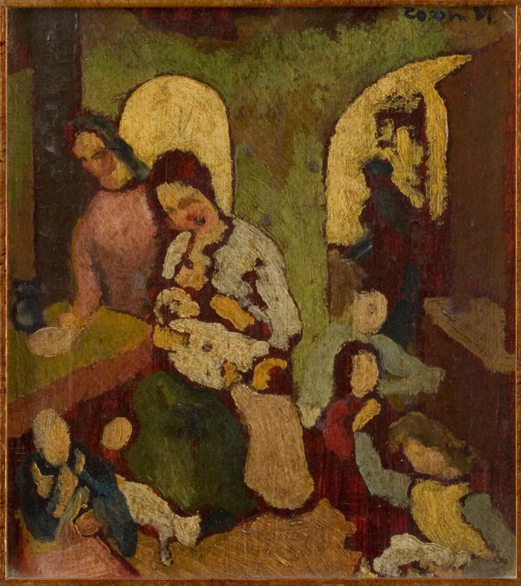 Al centro, figura femminile mentre allatta un neonato con a fianco figura femminile in piedi. In basso e a sinistra, gruppi di bambini seduti a terra. Sullo sfondo sono presenti due arcate. Utilizzo di tonalità piatte nella resa cromatica con totale assenza di sfumati. La definizione delle linee di contorno è solo per l'architettura del fondo, mentre le figure, caratterizzate dalla totale assenza fisiognomica, sono rese per macchie di colore. La scarsa quantità di colore utilizzato, rende in alcuni punti visibile il fondo della tavola.
