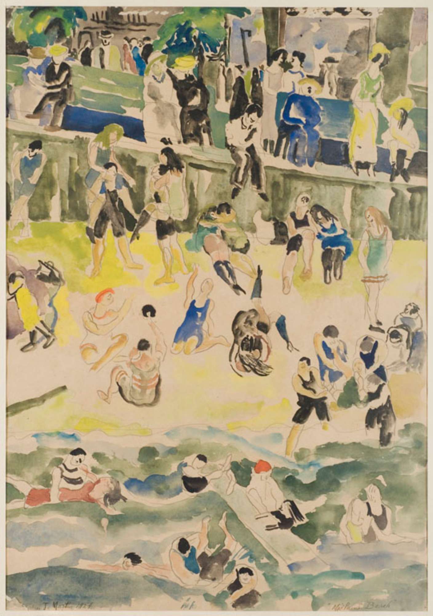 Al centro della composizione spiaggia con bagnanti. In basso, bagnanti in acqua. In alto, viale con passanti. Prevalenza di tonalità fredde (blu, verde); utilizzo del colore a macchie con uso della carta di supporto per i bianchi. Figure delineate dal disegno a matita.
