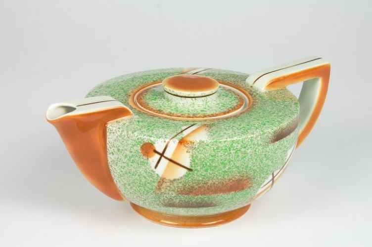 La teiera presenta un collo cilindrico, ma si allarga procedendo verso la base, assumendo forma bombata; appoggia su un profilo circolare in ceramica. Su un lato si nota un lungo beccuccio, dall'andamento sinuoso e curvilineo, e sul lato opposto un manico, di forma ricurva, saldato al recipiente. L'apertura superiore, a sezione circolare, presenta un bordo con incavo, ora sbeccato su un lato, atto ad accogliere il coperchio, di forma emisferica, non più provvisto di pomolo. La composizione decorativa si sviluppa su fasce sovrapposte, è caratterizzata da due motivi principali intercalati da tre fasce a decorazione geometrica, con linea ondulata racchiusa da emisferi. Sulla circonferenza di massimo diametro spicca il motivo "a palmette" che caratterizza l'intero servizio: una linea curva che vede ripiegare e rifiorire al suo interno i propri estremi. Il motivo è dipinto con smalto rosso su fondo bianco ed è completato dall'intercalare di petali dorati a forma di goccia. L'altro motivo, anch'esso ripetuto modularmente, propone invece un fiore stilizzato formato da due foglie aperte a calice con petalo centrale, decorato da un punto dorato. Palmette di differenti dimensioni sono presenti anche sulla parte bassa del beccuccio, nella zona di saldatura del manico, nonché sulla superficie esterna del coperchio.