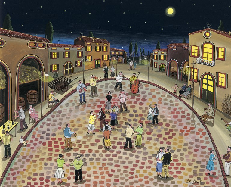 Sotto un cielo stellato e sopra uno spiazzo circondato da case e fienili, si svolge una festa danzante. I contadini ballano, suonano e gustano vino rosso.