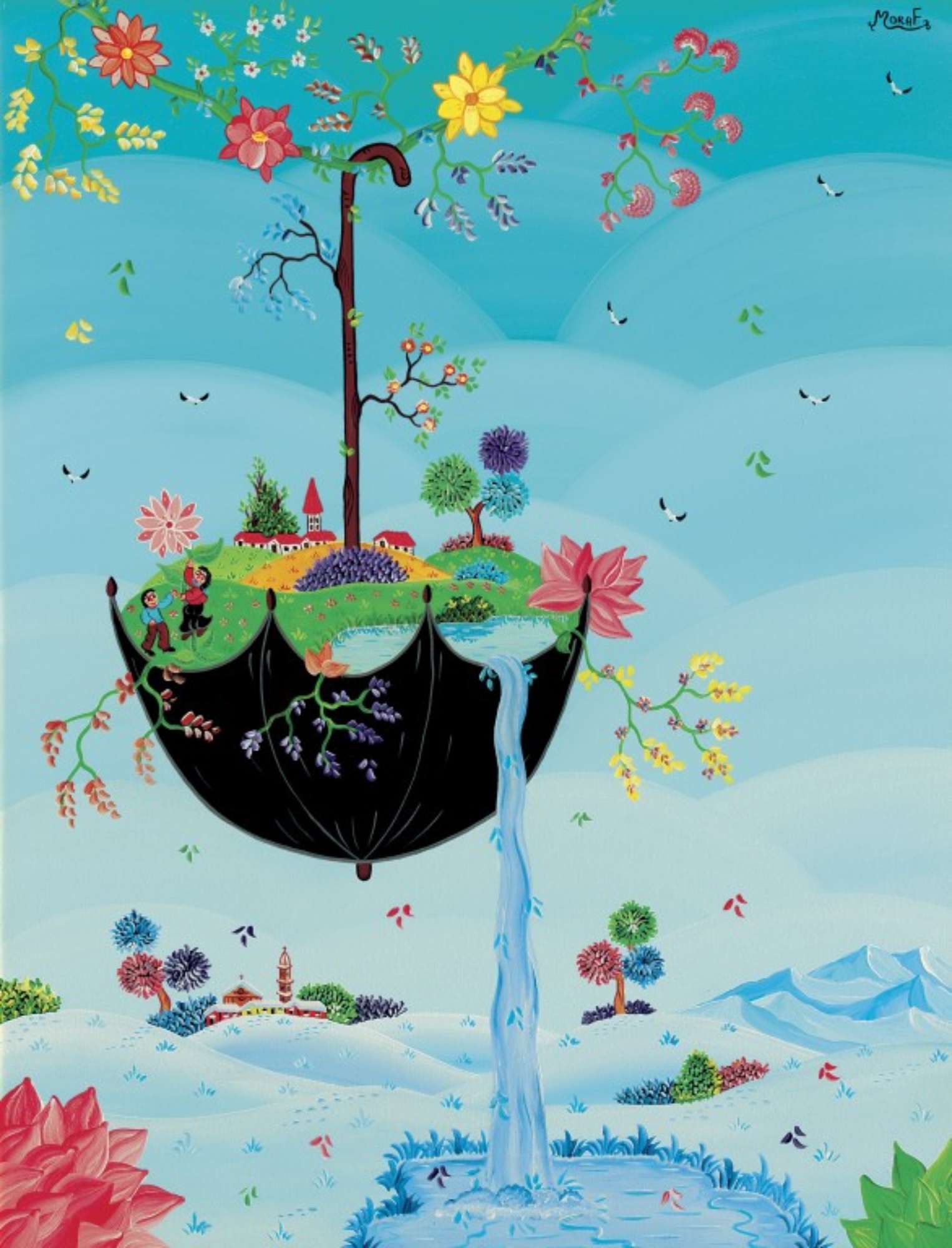 Il dipinto rappresenta, in chiave fiabesca, l'esplodere della primavera. La cavità di un ombrello aperto contiene un paesaggio in miniatura da cui l'acqua di un laghetto deborda tuffandosi a cascata in un altro lago facente parte di un altro paesaggio.