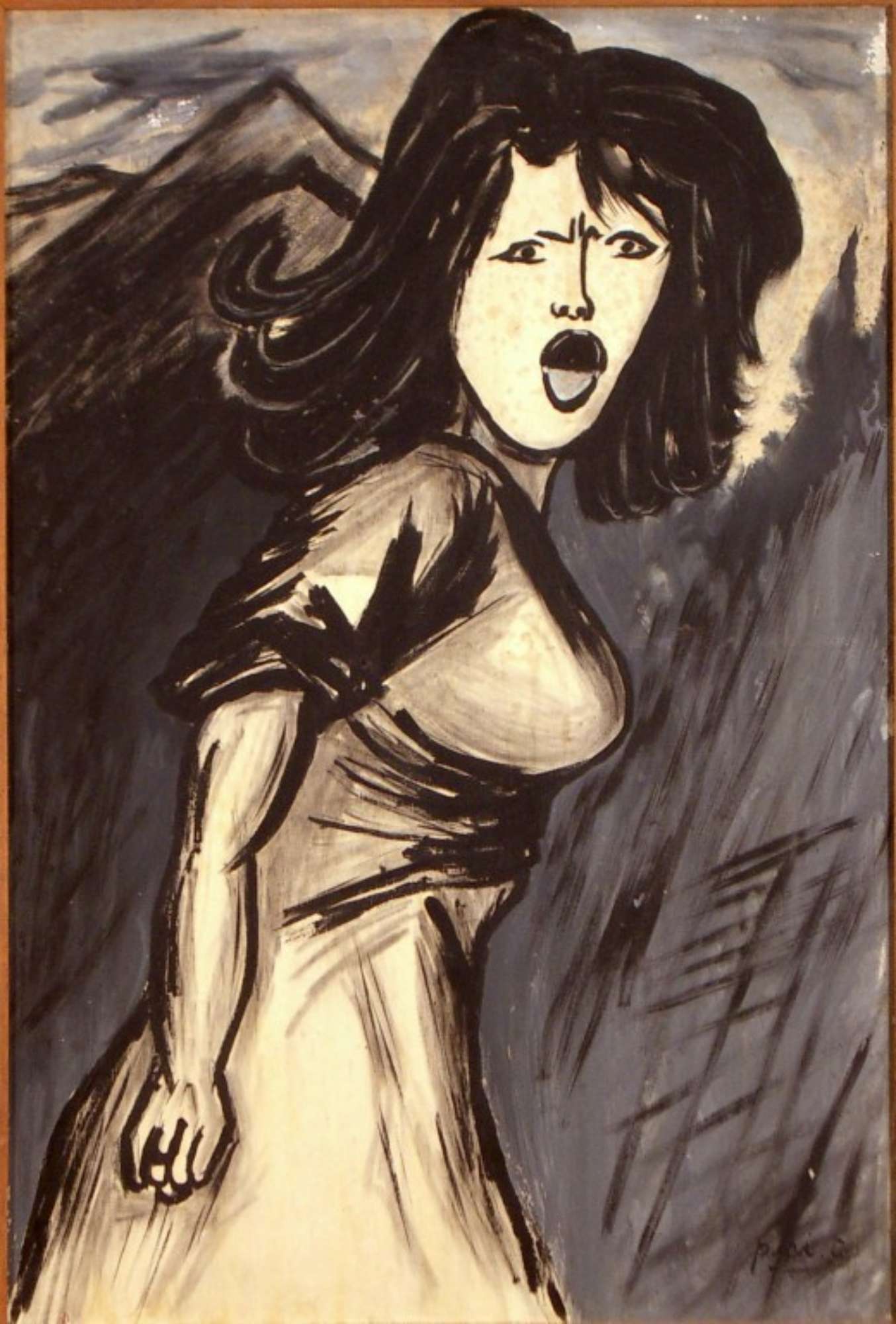 Tavola di legno dipinta a tempera con una ragazza dall'atteggiamento combattivo e la bocca aperta nel canto..