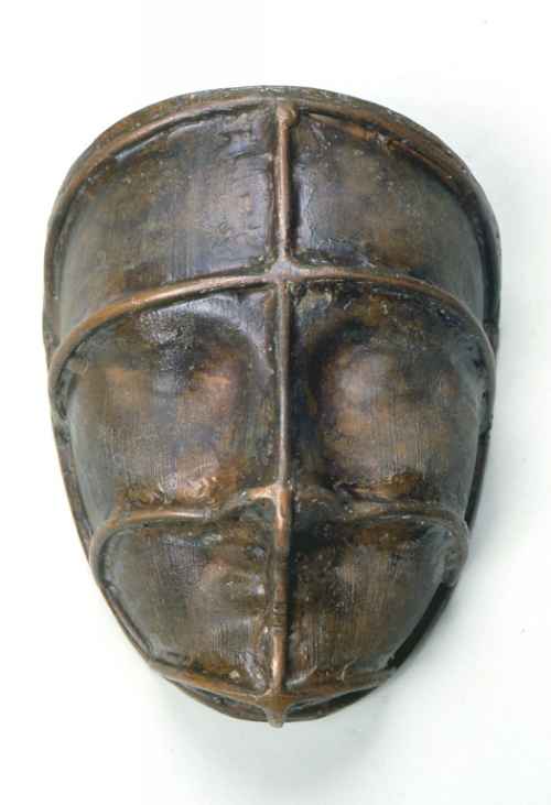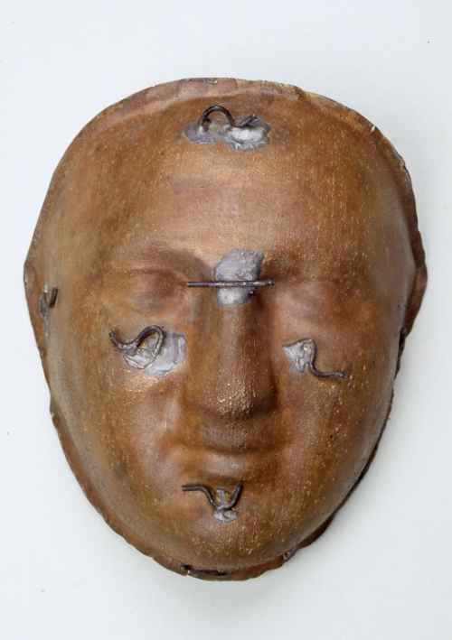 Il recente intervento di restauro alla quale l'opera è stata sottoposta ha comportato delicate operazioni di pulitura a secco per la rimozione dello sporco superficiale; consolidamento delle parti degradate con appretti e collanti naturali a base di cellulosa, compatibili con le colle originali; ritocco finale per uniformare le parti consolidate e per velare ed abbassare la tonalità della parte trattata, in modo tale da rendere leggibili gli interventi ai quali il manufatto è stato sottoposto; sistemazione e riassetto strutturale della forma; protezione finale con stesura di un sottile velo di cera microcristallina. Nell'inventario allegato all'atto di acquisto della collezione "Cattabiani" da parte del Comune di Castelnovo di Sotto, la maschera è identificata come "copia del modello X-15", nella sezione "prototipi di maschere ", con il numero MIC 91 (Masch. It. Cervi). Anche i riferimenti cronologici generali dell'opera sono stati dedotti dall'inventario e possono comunque essere storicamente ricondotti al periodo di attività della Fabbrica Guatteri (1810 ca.-1933) di Castelnovo di Sotto.