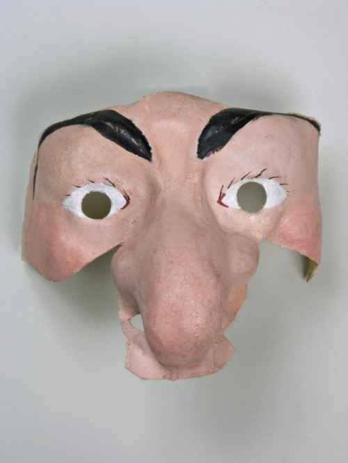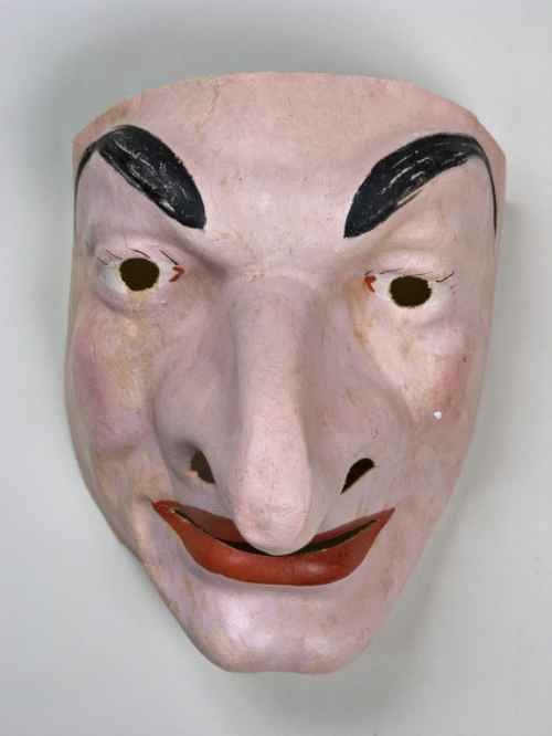 Maschera, in tessuto cerato, raffigurante un vecchio con rughe. Il soggetto rappresentato è caratterizzato da un incarnato rosa cipria, che assume sfumature più intense sugli zigomi sporgenti. Le sopracciglia sono marcate, rese con una rapida pennellata nera, non uniforme, e incorniciano piccoli occhi con le orbite oculari forate, con ciglia nere, rade e filiformi. Le guance sono scavate e il modellato presenta spessori diversi in tutto il volto per suggerire la presenza di rughe, segnate anche sulla fronte. Il naso è leggermente aquilino, con minuscole narici aperte. La bocca, piccola e carnosa, con labbra di color rosso acceso, è aperta e lascia intravedere una fila, ben disegnata, di denti bianchi. Il mento è piccolo e poco marcato. Queste caratteristiche conferiscono un'espressione sorridente e serena al soggetto maschile raffigurato.