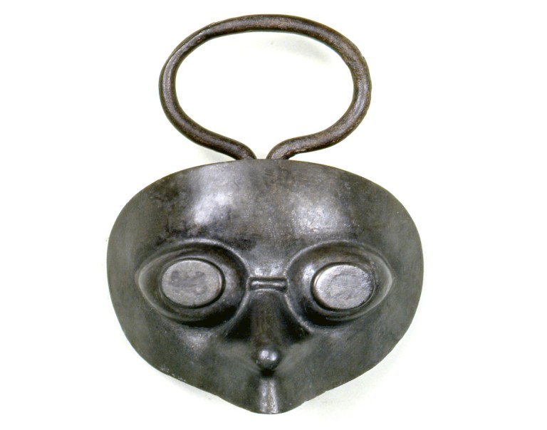 Controstampo, per beuta, a mezza mascherina veneziana con occhiali, in lega di zinco, con maniglia in ferro posta alla sommità, direttamente inserita nel metallo.
