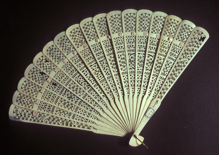 Ventaglio di tipo "brisé", finemente traforato a motivi geometrici per tutta la superficie. Un nastro passante in seta lega le stecche. Il tipo di decorazione e la particolare lavorazione riconducono l'oggetto ad ambito cinese intorno alla fine del XIX secolo.