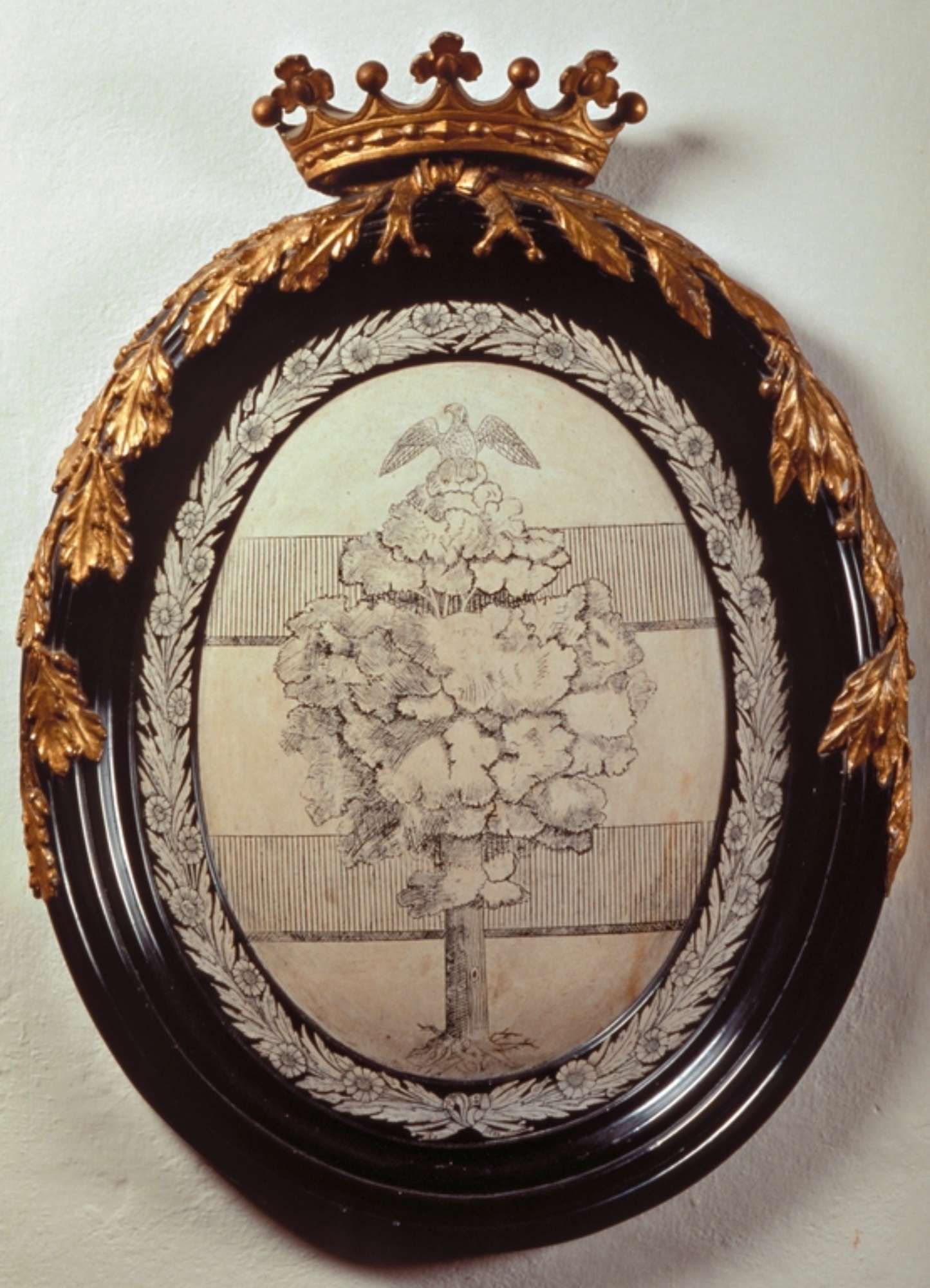 Di forma ovale, leggermente bombato con cornice in scagliola rilevata e ornata di foglie di lauro e sovrastata da una corona a tutto tondo.