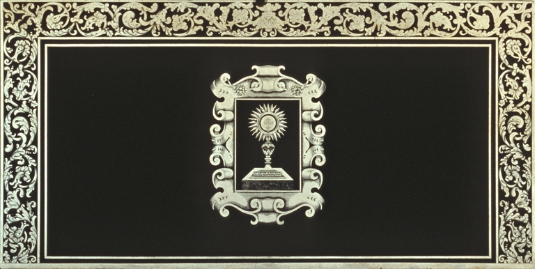Una cornice di racemi bianchi orna tre lati del piano. L'immagine centrale è composta da un unico cartiglio rettangolare a cornice di volute arricciate e contrapposte e raffigurante all'interno un ostensorio raggiato con piede e nodo decorati a foglie d'acanto. Bicromia bianco e nero.