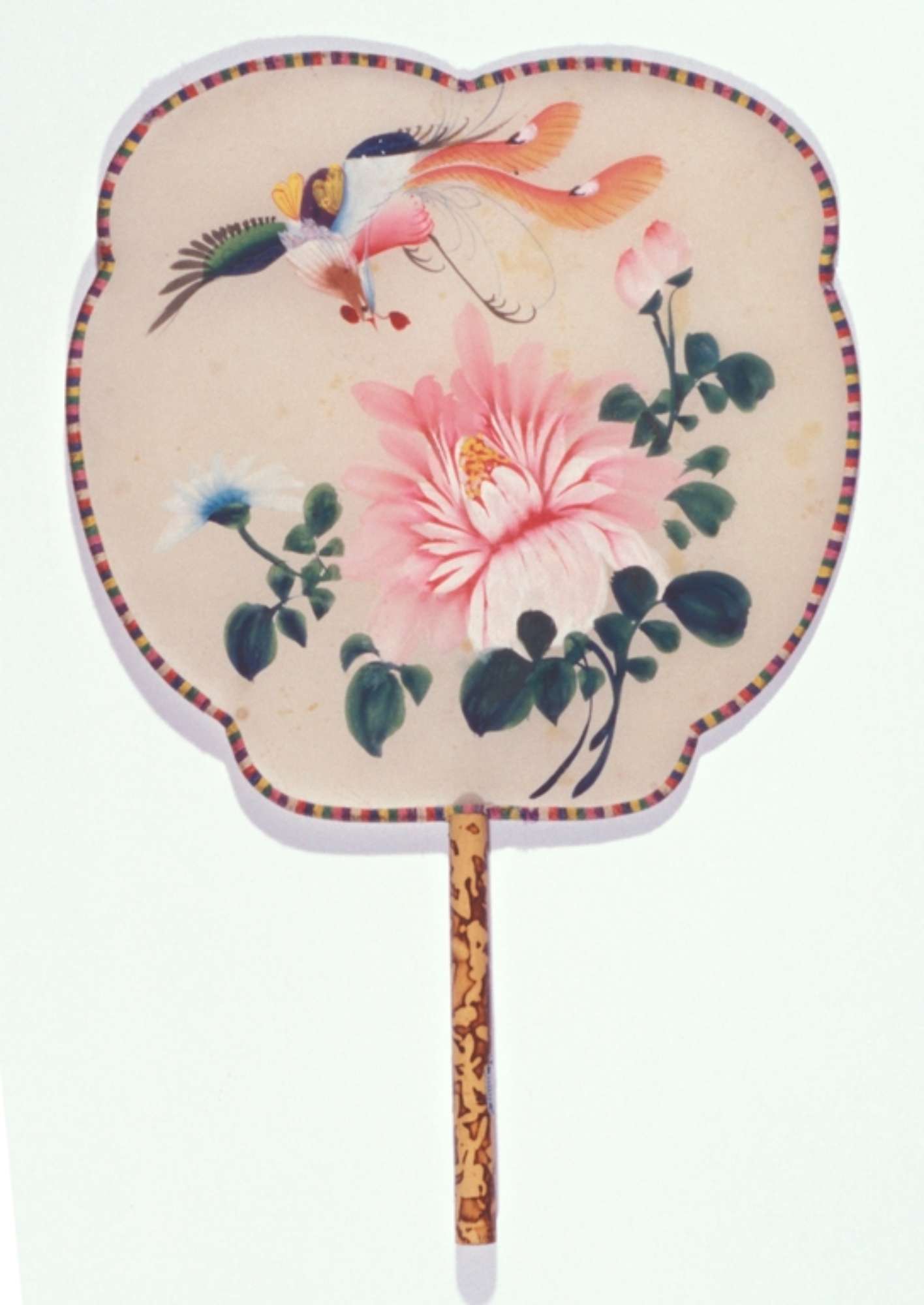Ventola a schermo fisso, con il corpo in seta dipinta a fiori e uccello in volo. Manico in legno dipinto.