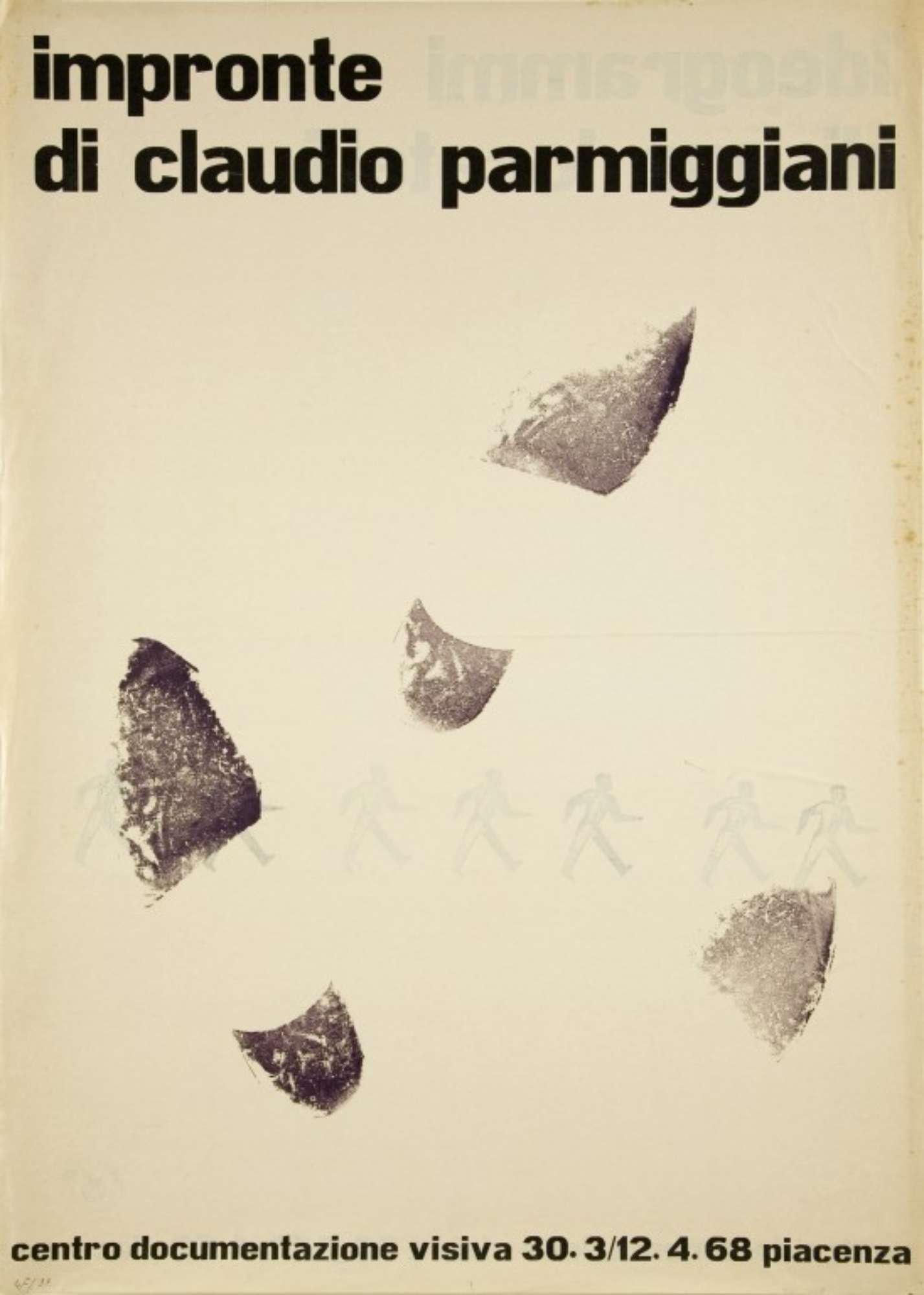Manifesto bifacciale. Litografia con impronte e timbri. Reca l'iscrizione per esteso "Centro documentazione visiva, 30.3/ 12.4 68 Piacenza" e il timbro del comune di Fiumalbo (MO).