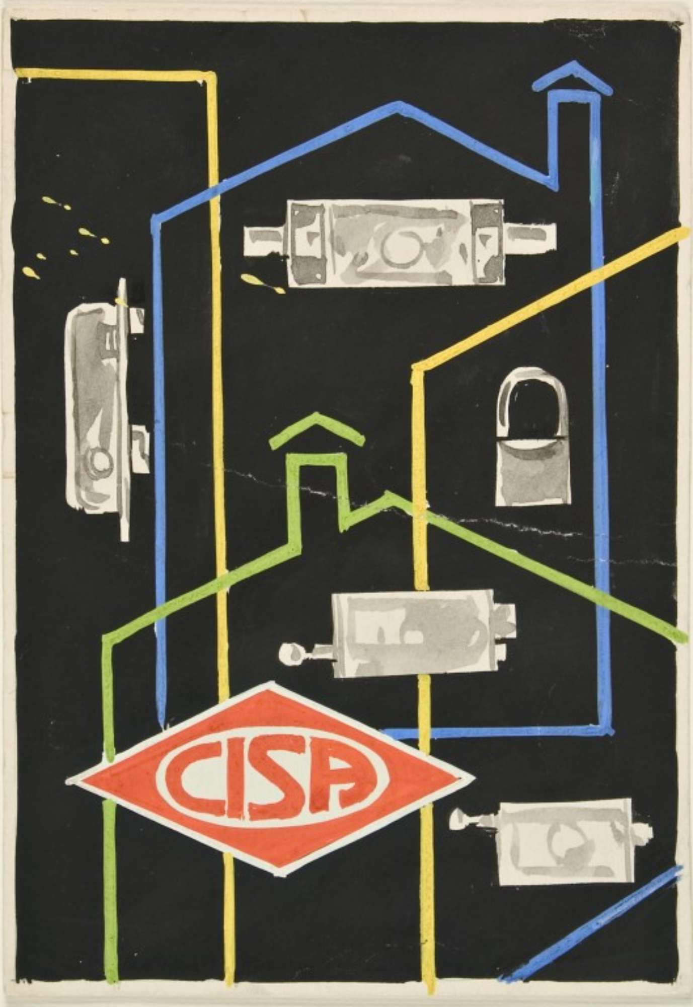 Sagome di edifici e disegni di serrature. Logo CISA.