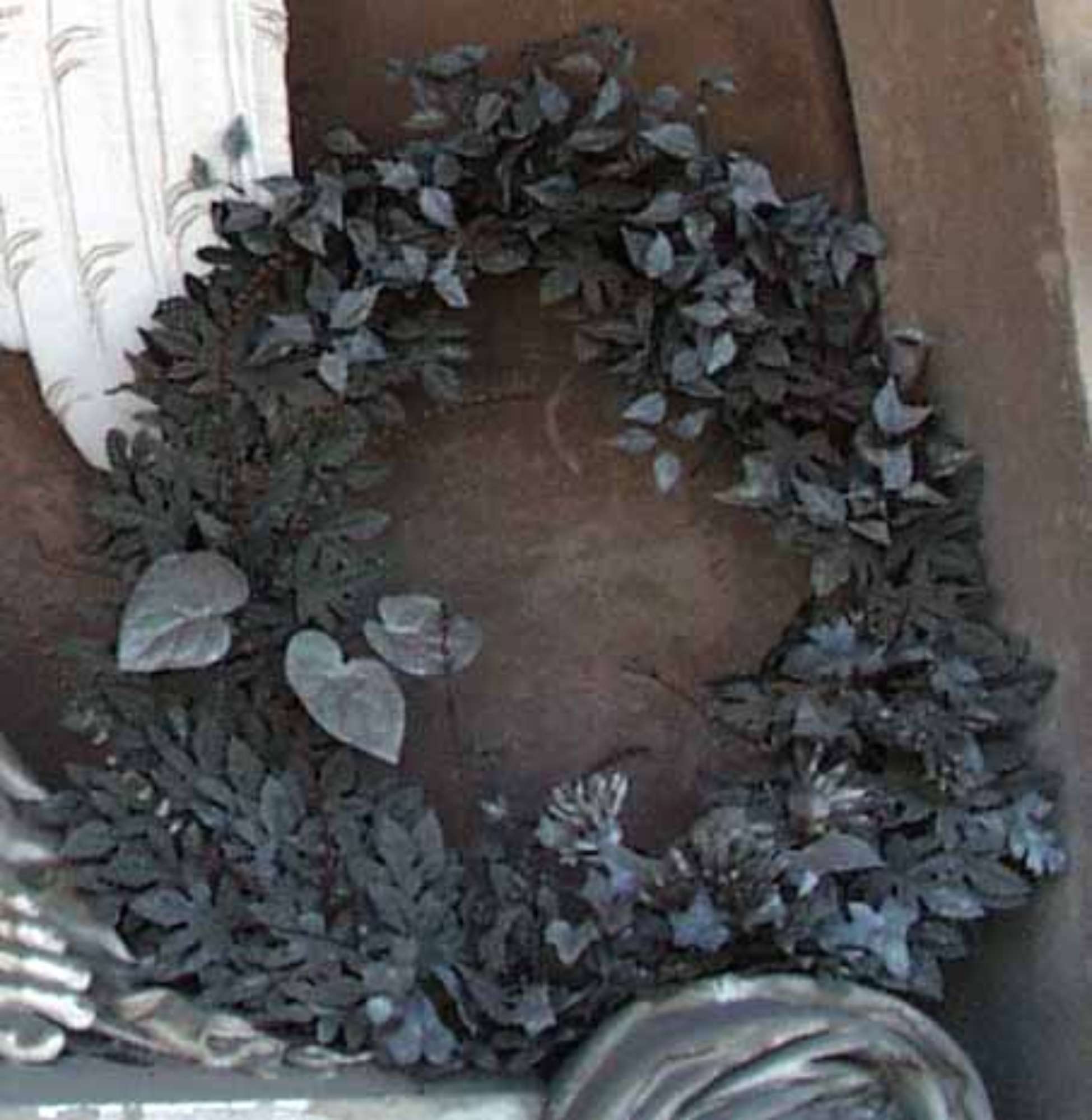 Elemento in ferro battuto dipinto di verde raffigurante una corona di rami e foglie di arbusti diversi intrecciati fra loro.