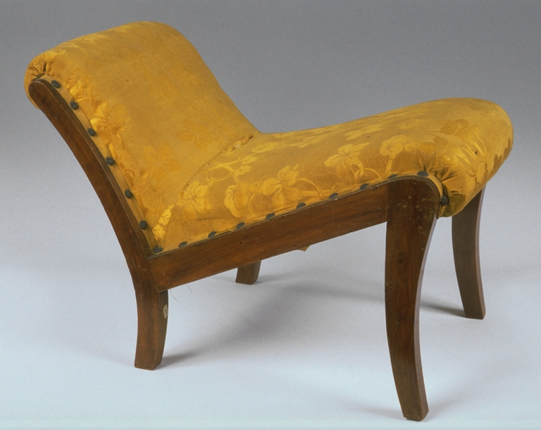 Con sostegni ricurvi e tappezzeria in damasco giallo tono su tono.