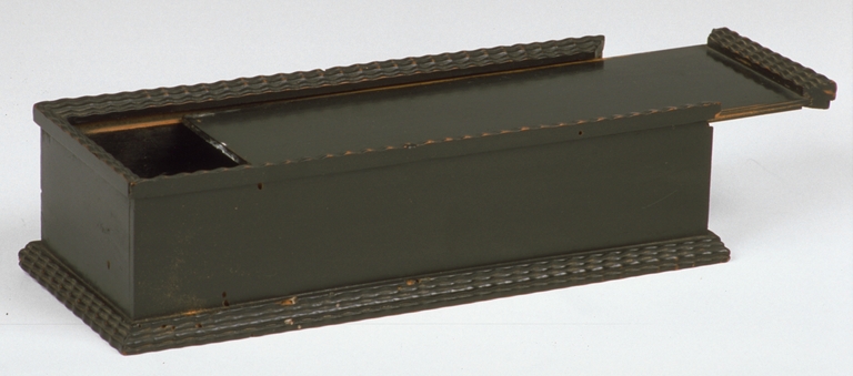 Scatola in legno scuro verniciato con decoro tipo guilloché nella base e nel bordo superiore. Coperchio scorrevole.