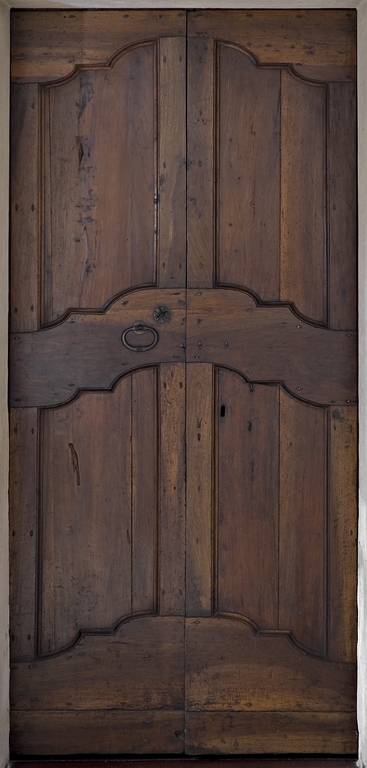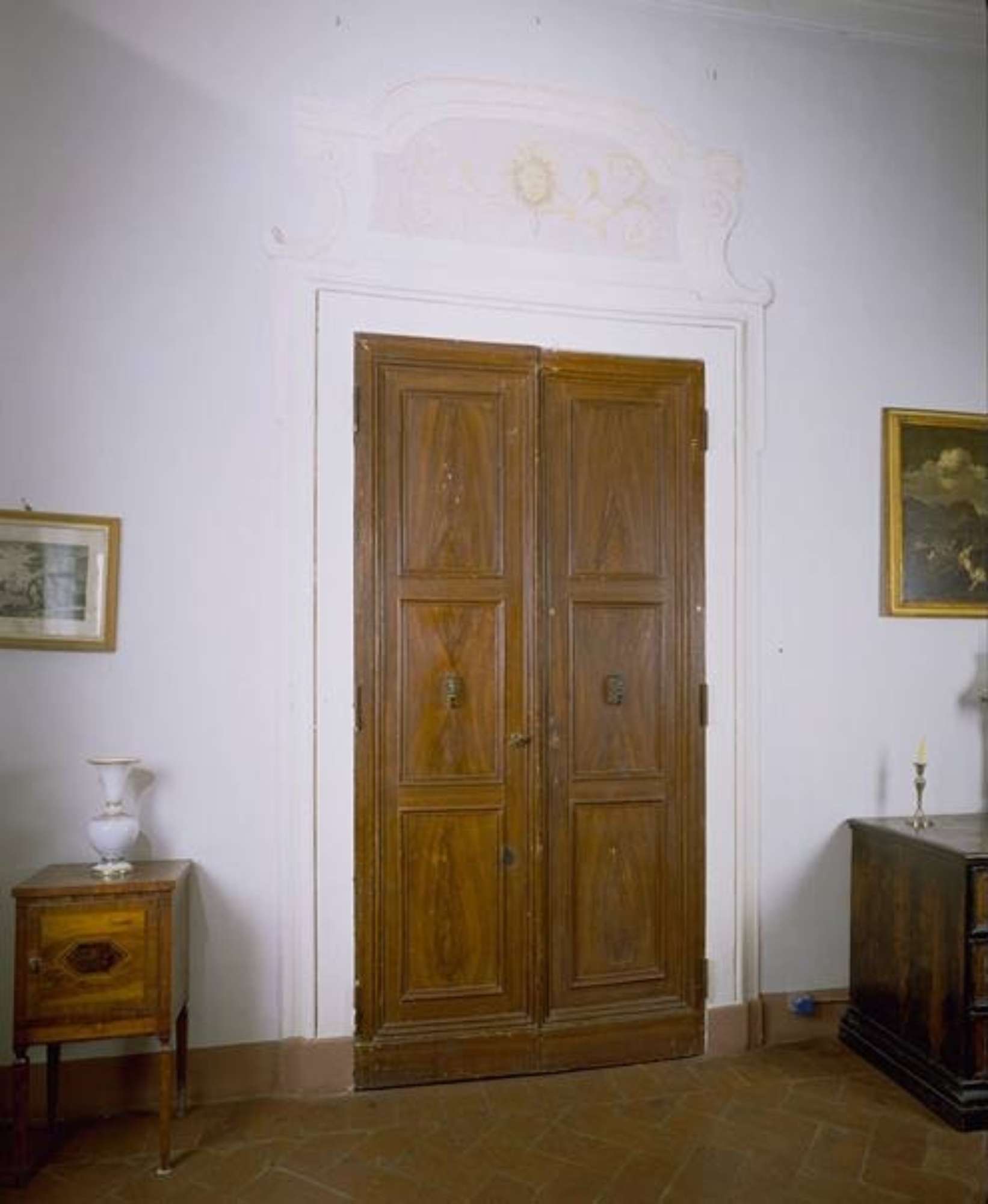 A due ante con tre specchiature per anta profilate da cornici. In legno dipinto a finto noce. Sulla porta una decorazione illusionistica vuole suggerire una sovrapporta in stucco con decorazioni a rilievo.