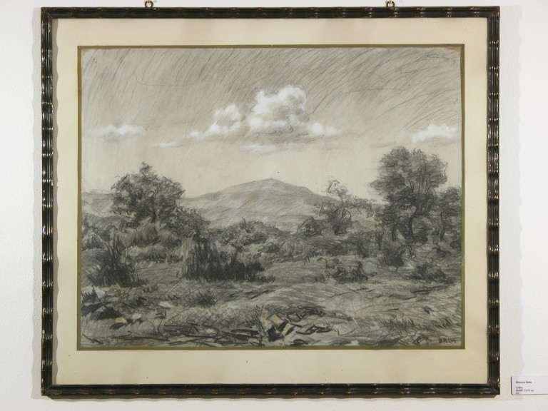 Paesaggio trattato con linee sintetiche e veloci a pastello, raffigurante un prato incolto con alberi e arbusti in primo piano e una montagna in lontananza. Il cielo, sereno all'orizzonte ma quasi livido in primo piano, presenta qualche nuvola bianca realizzata a tempera. Firmato in basso a destra: BALLA.