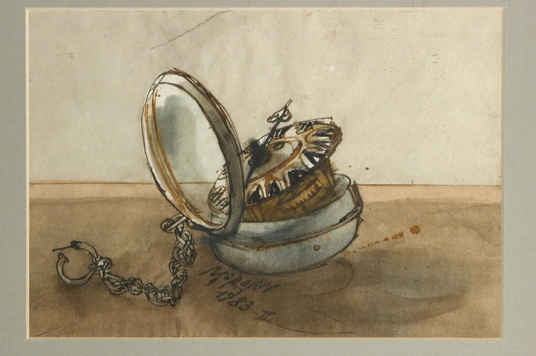 L'opera raffigura orologino con catenella, aperto su ripiano.