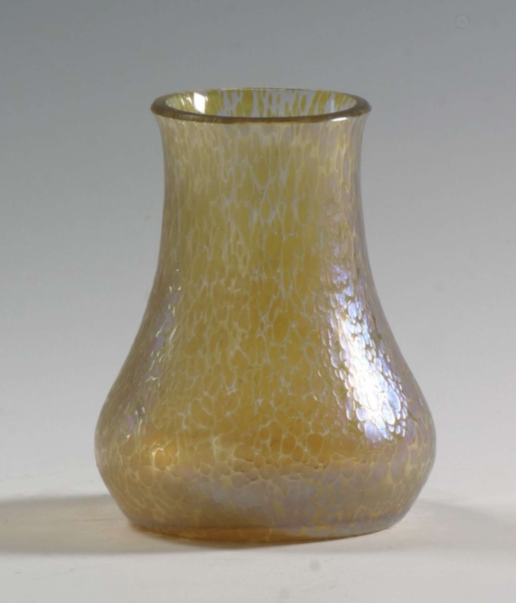 Vaso in vetro soffiato leggermente iridescente sui toni dell'ambra con forma a bulbo e collo allargato.