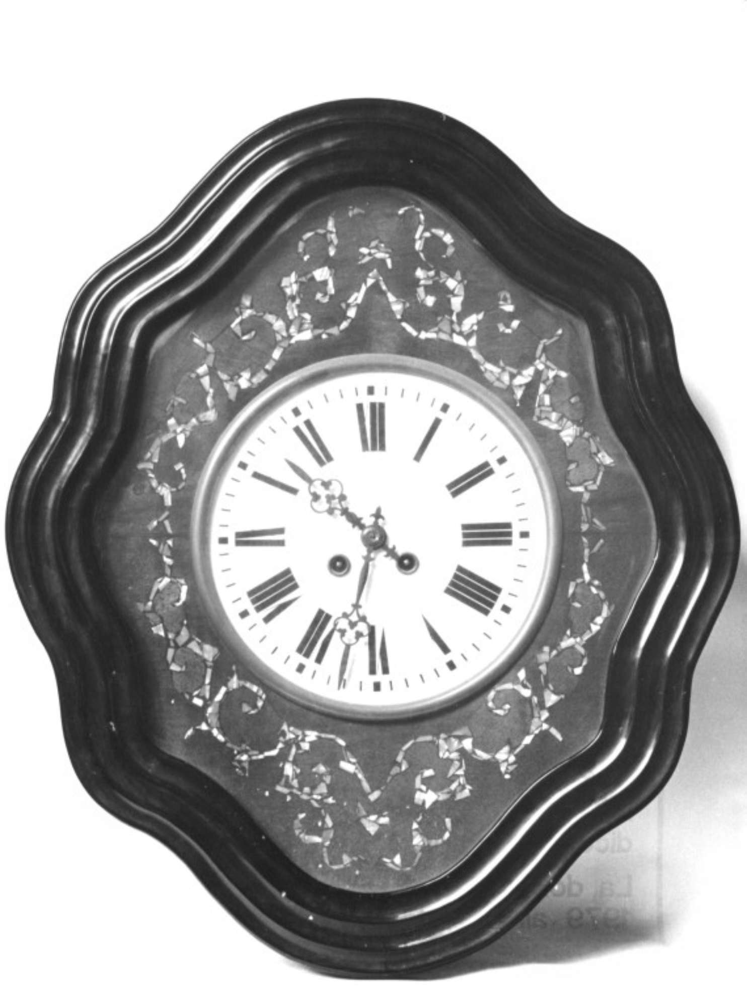 Attorno al quadrante circolare, l'orologio ha una cornice in legno con intarsi di madreperla delimitata a sua volta da una cornice sagomata in legno verniciata di nero.