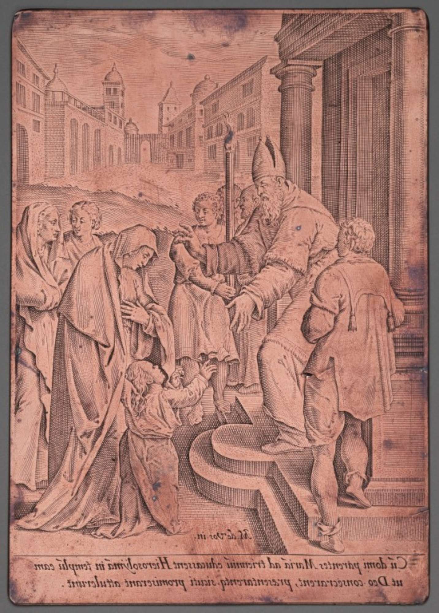 La matrice calcografica, opera firmata di Marten de Vos, raffigura secondo stilemi italiani il tema della 'Presentazione di Maria al tempio'. La scena, eseguita con grande finezza, riprende modelli pittorici di ambito bolognese. La curata realizzazione dell'ambiente urbano e dei rapporti gestuali tra le figure è degna di uno dei più rilevanti esponenti della tradizione incisoria fiamminga.