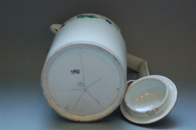 Caffettiera cilindrica con decoro composto da una ghirlanda di foglie di vite e grappoli d'uva, che si ripete nella parte superiore del corpo e nel coperchio. policromia. Dipinto in verde, azzurro e bruno con filetti dorati.