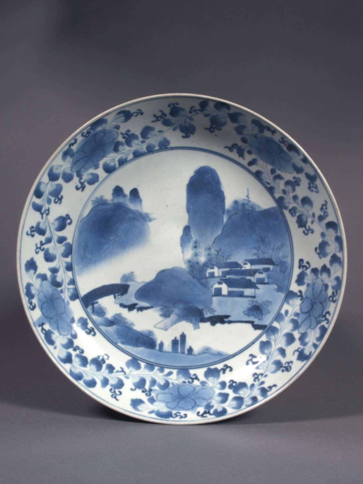 Piatto da esportazione, a bacino calottiforme su basso piede rilevato; dipinto in blu cobalto sotto coperta (sometsuke) con mascherine e a pennello con ampie stesure di ossido molto diluito. Il bacino è decorato da un medaglione paesaggistico, di colore bianco e blu, entro doppio cerchio che sottolinea una larga banda riempita da un sinuoso serto floreale. La parete esterna è decorata da un serto floreale (margherite?), alquanto stilizzato. Sulla base è presente entro un largo cerchio blu una marca di un solo ideogramma entro doppio cerchio che sembra potersi leggere come ki (gioia).