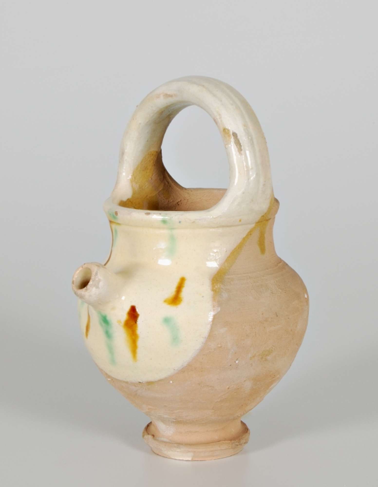 Piccolo orcio (giocattolo) a forma ovoidale su alto piede con beccuccio tubolare applicato sulla spalla e manico a paniere. Rivestimento ad ingobbio con colature in verde e giallo nella parte del versatore e sull'ansa.