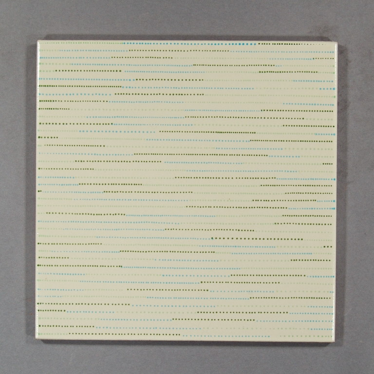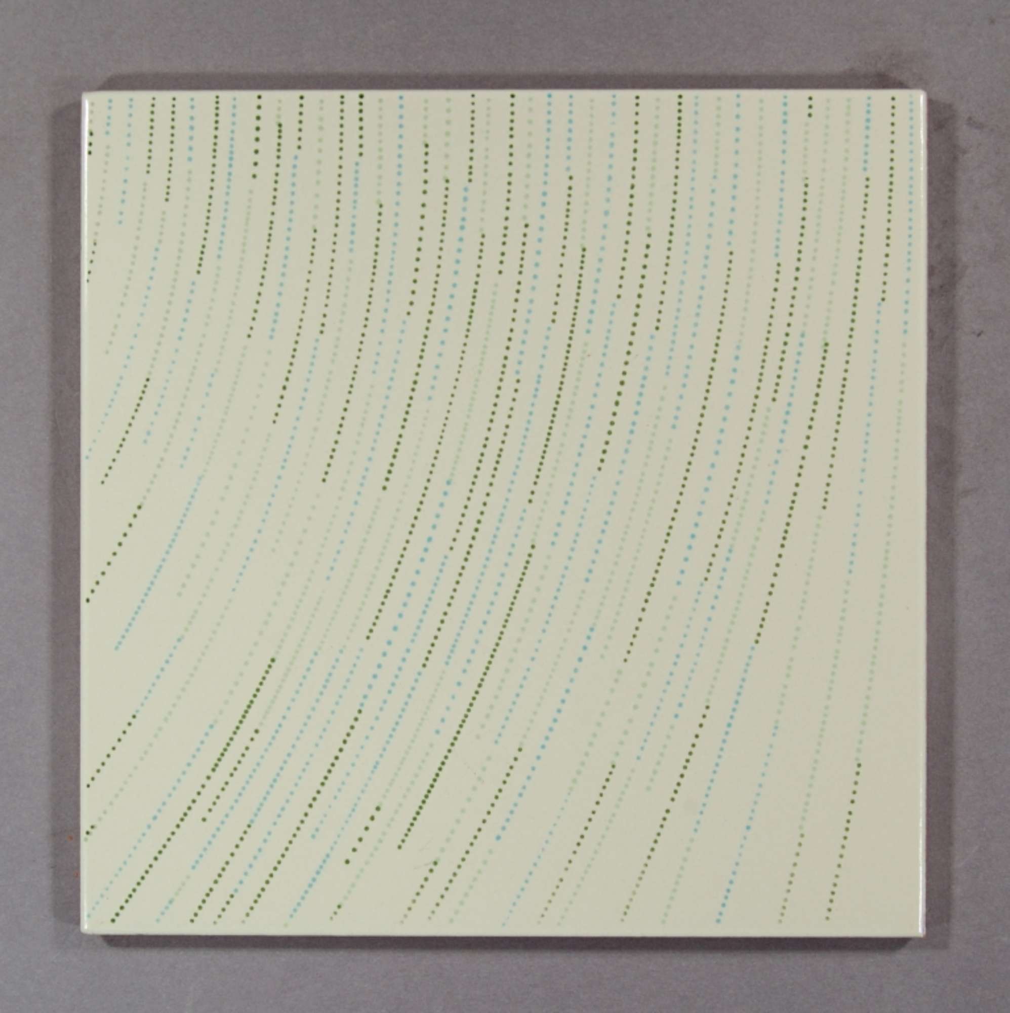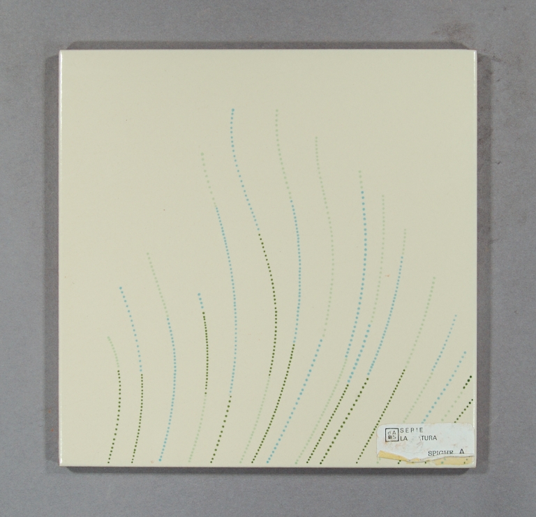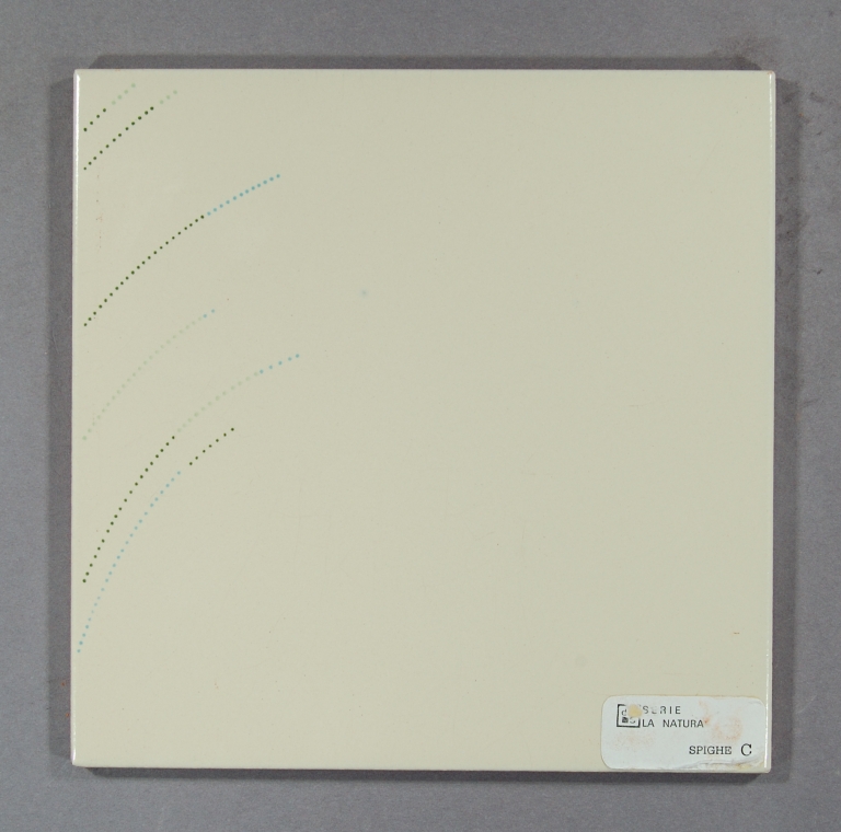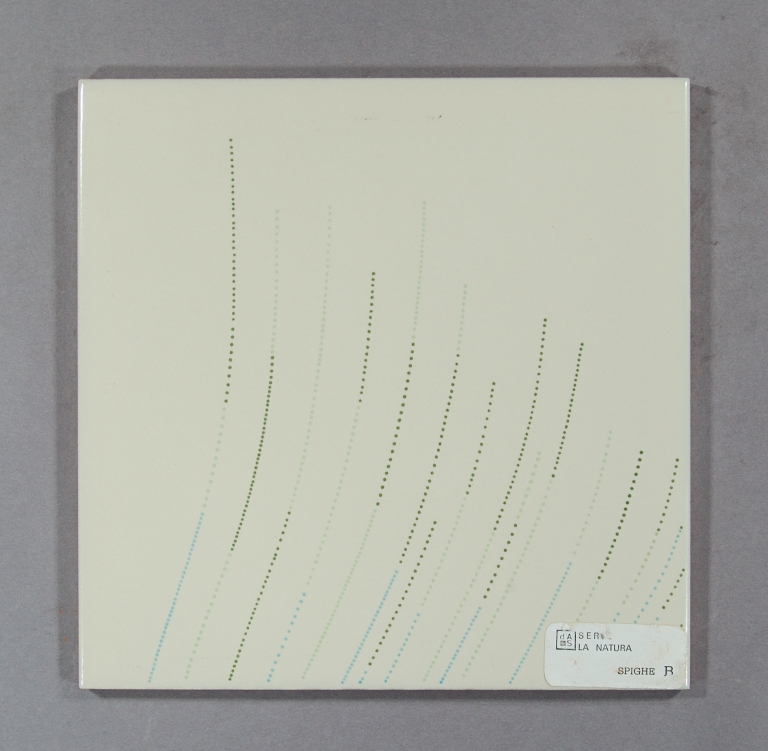 Serie "La Natura – Spighe", 24 piastrelle smaltate a tinta unita di colore beige, 20 delle quali decorate a serigrafia con linee formate da punti di colore azzurro e verde: