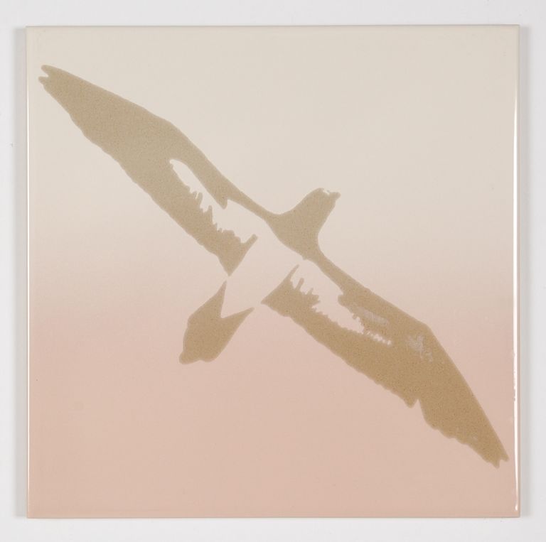 L: 2 piastrelle con disegno albatro e sfumatura rosa/grigio;