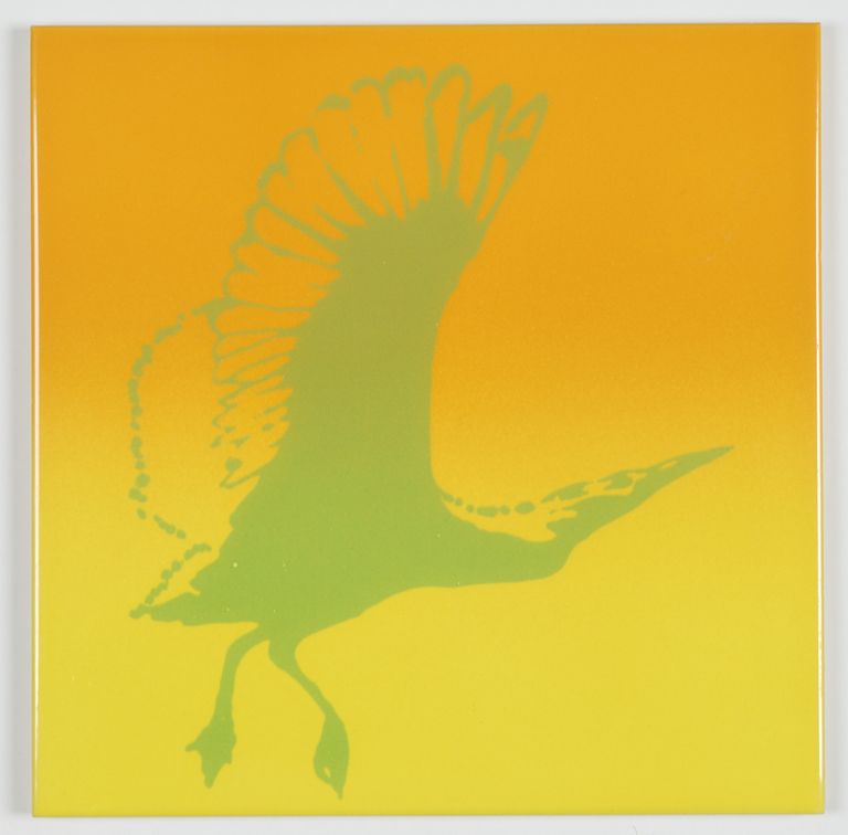 L: 1 piastrella con disegno airone e sfumatura arancio/giallo;