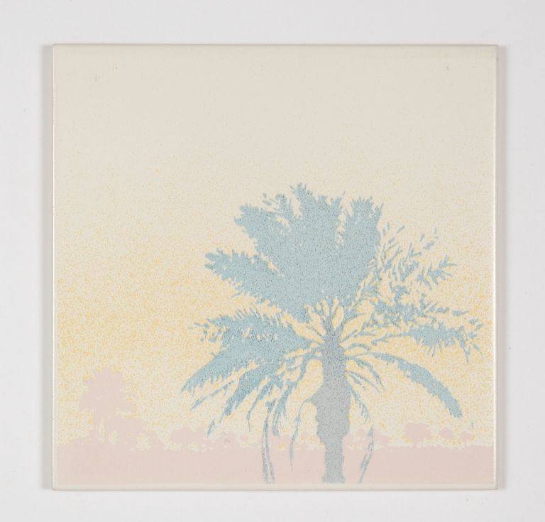c: 2 piastrelle decorate con sagome di palme blu e fasce di colore, come a ricreare i riflessi d'acqua;