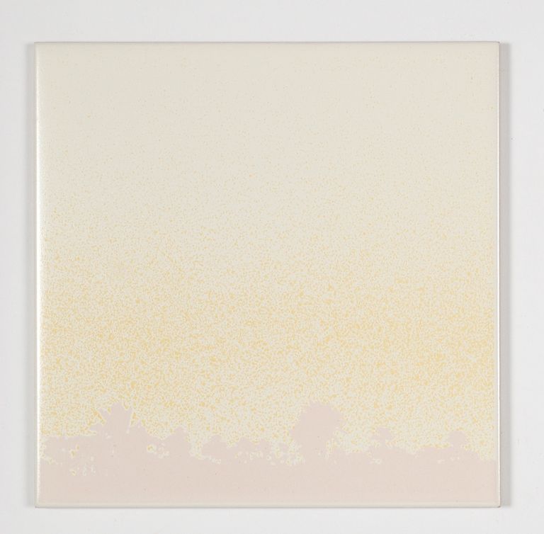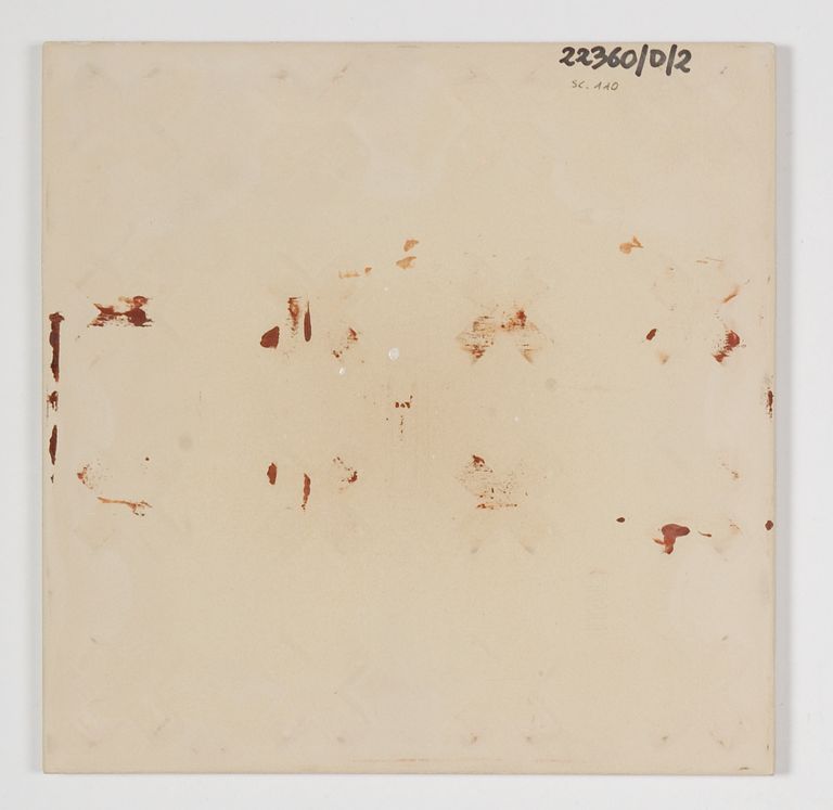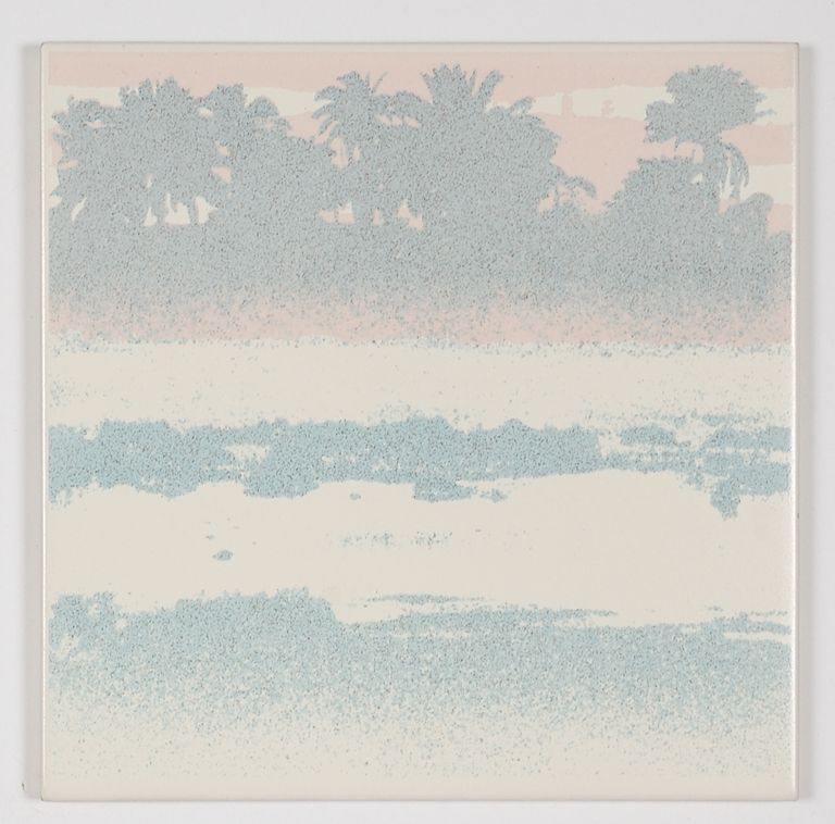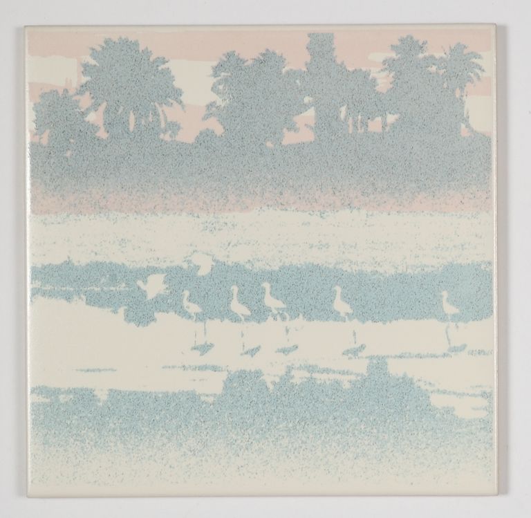 d: 2 piastrelle decorate con sagome di palme blu e di uccelli e fasce di colore, come a ricreare i riflessi d'acqua;