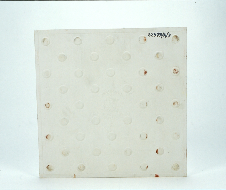 Piastrelle serie "I Neoclassici" bianche lucide dette "diamantate" per i lati dai profili smussati. Le decorazioni sono serigrafiche in due colori con la tecnica della riserva e "lavato".