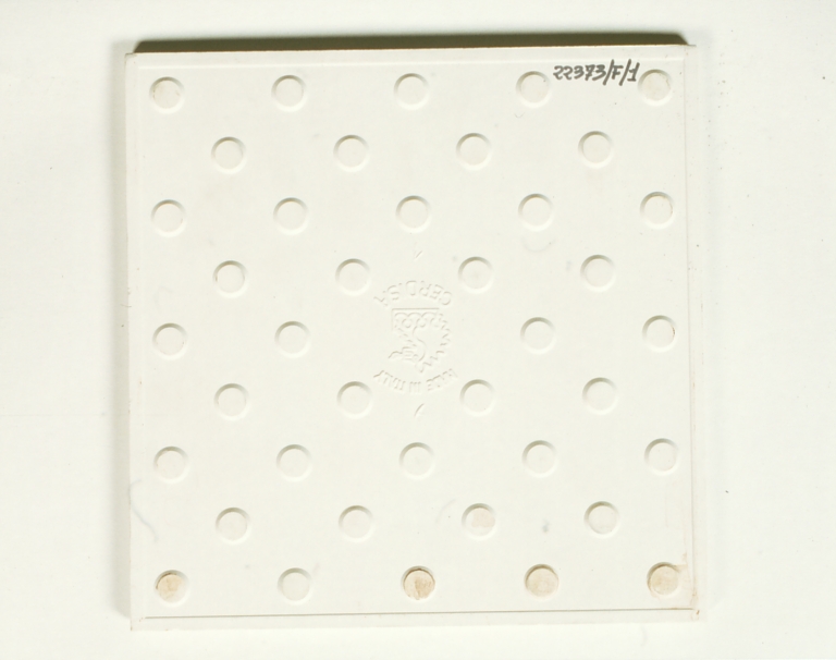 c: "Ecuba 1 azzurro" 1 piastrella con decorazione circolare simile ad una ruota stilizzata nei colori blu e grigio;