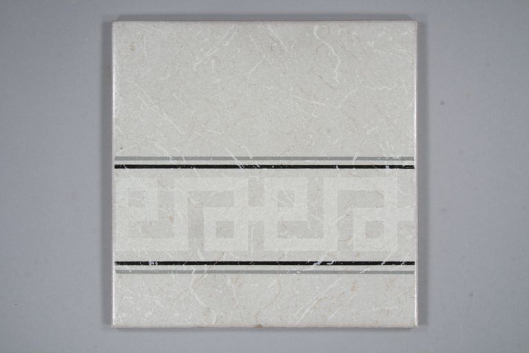 e: "Paros Grigio 2" decorata con una fascia dai motivi greci;