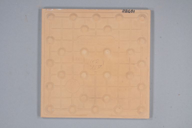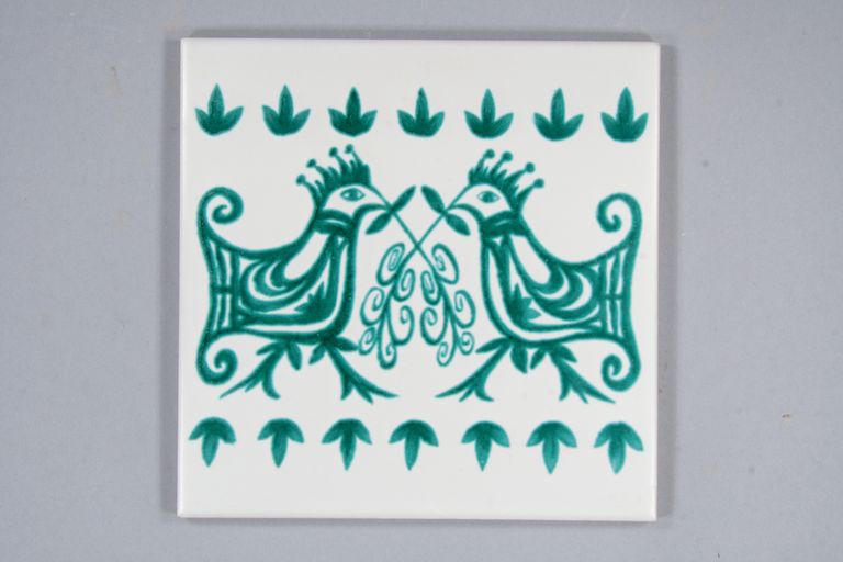 Piastrella decorata con due galletti in monocromia serigrafica in verde rame lucido su fondo matt.