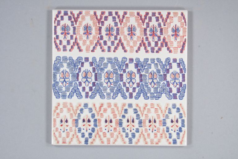 Piastrella decorata con motivo a tre fasce geometrico-floreale e disegno in serigrafia a tre colori sopra smalto bianco matt.