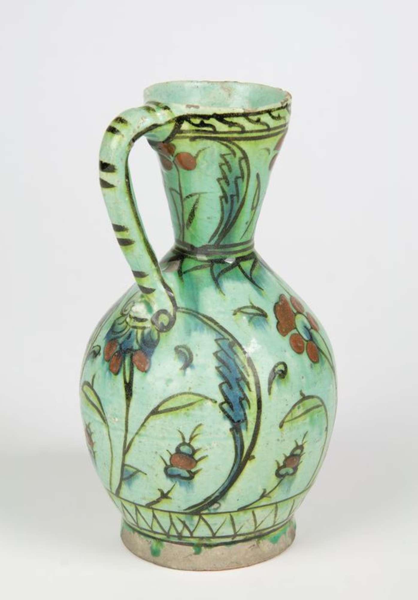 Il motivo profilato in nero e campito in verde, rosso e blu, comprende steli sinuosi di garofani e altri fiori, alternati a foglie piumate tipo "saz", disposti sia sul corpo che sul collo; due linee parallele marcano l'attacco tra collo e corpo, il bordo è ornato da una "fune lenta" e la base da un motivo a a zig-zag; coppie di tratti paralleli ornano l'ansa. La vetrina e verdastra.