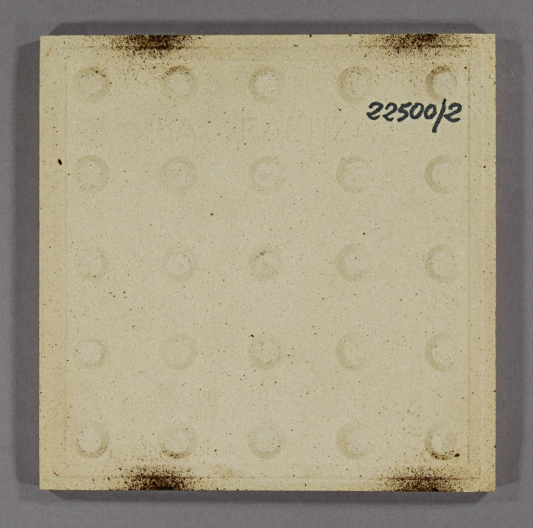 Piastrella decorata con l'utilizzo di mascherina in rame. La decorazione è composta da 8 quadrati disposti su 2 file e 2 fasce di differente spessore; la decorazione è di colore nero su fondo grigio.