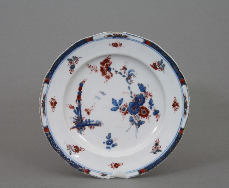 Piatto ad orlo sagomato, con decorazione di ispirazione orientale Imari con i tipici fiori "indiani". Dipinto in turchino a gran fuoco e rosso ed oro a piccolo fuoco.