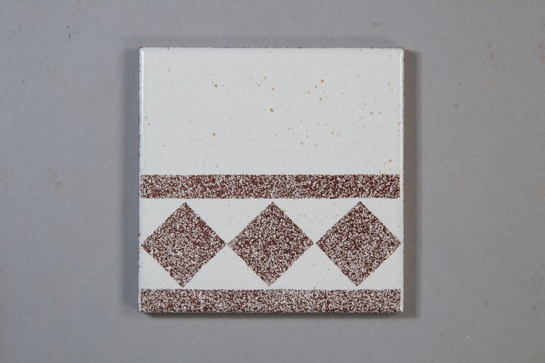 Piastrella in gres rosso smaltato in bicottura. Il rivestimento bianco lucido puntinato ad effetto "sale e pepe" è dovuto alla sovrapposizione di uno smalto bianco ad un fondo di preparazione reagente al ferro applicato per discatura. La piastrella è decorata a serigrafia marrone con 3 quadrati posti tra due fasce, la decorazione occupa metà della superficie.
