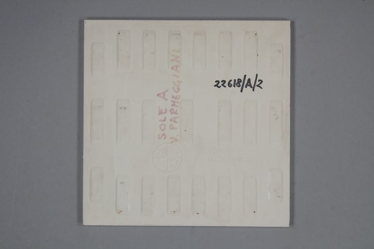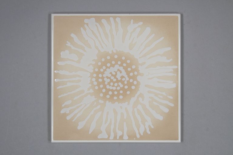 "Sole", piastrella realizzata con una serigrafia retinata beige sul supporto. Una applicazione di cristallina lucida. Una serigrafia di riservante per la tecnica del lavato, con lo smalto bianco che si è ancorato solo nella zona del disegno del sole e della cornice,